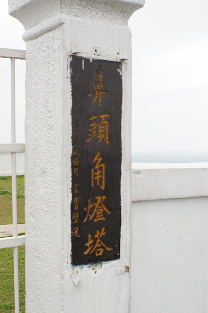 在步道旁看到一布條, 便自然離開步道往布條處走, 爬上H65m峰沒有基石有一石柱上刻 "鼻頭角燈臺所在地"